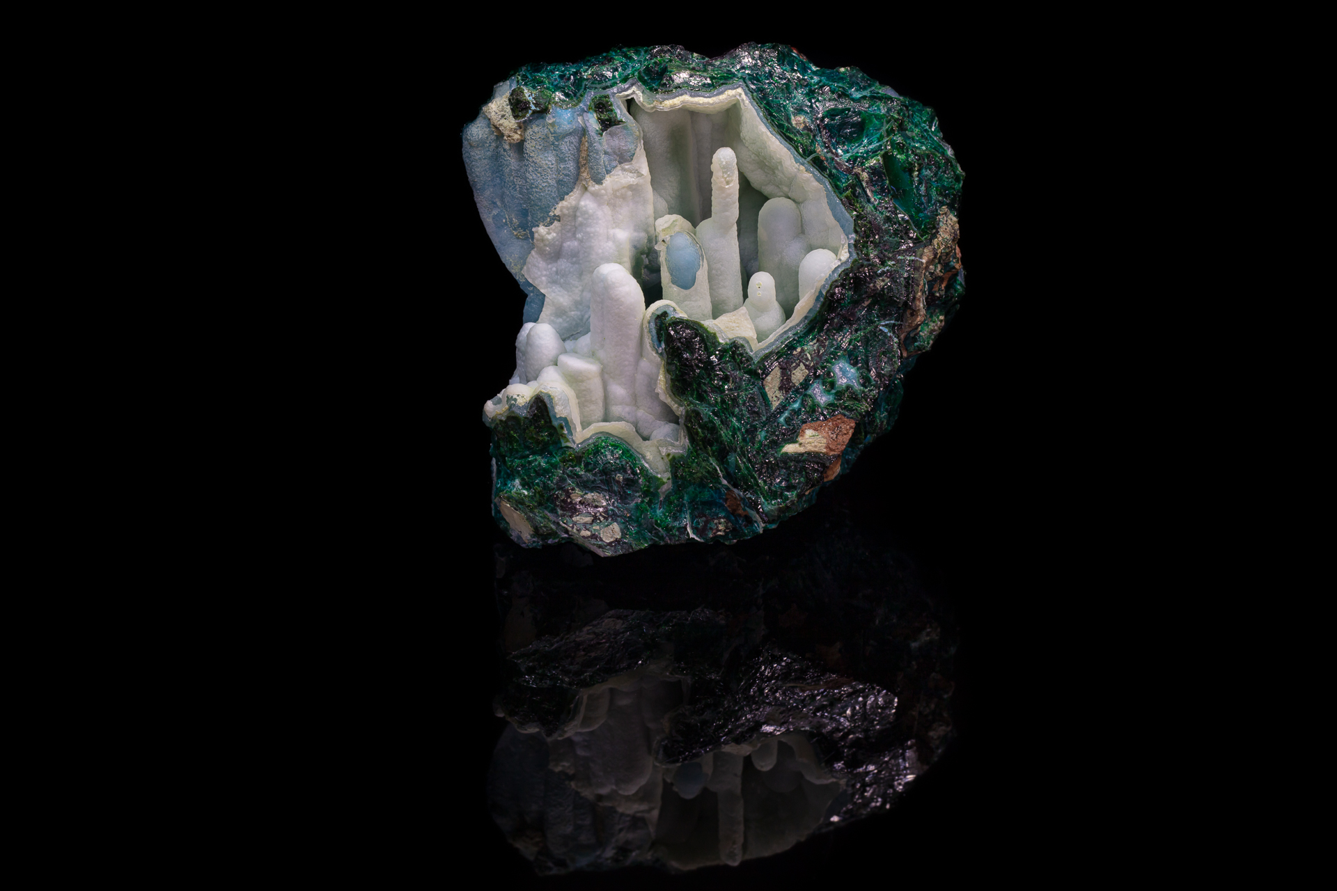 Chalcedony: A compact variety of microcrystalline quartz, chalcedony is composed of microscopic fibers. It can be mammillary, botryoidal, or stalactitic, and is found in veins, geodes, and concretions. It is white when pure, but much chalcedony contains trace elements or microscopic inclusions of other minerals giving a range of colors.. Many of these colored chalcedonies have their own variety names, chrysoprase is green, carnelian is red, sard is dark brown, bloodstone is dark green, jasper is most often red. Agate is a semiprecious type of chalcedony that presents multiple colored bands.